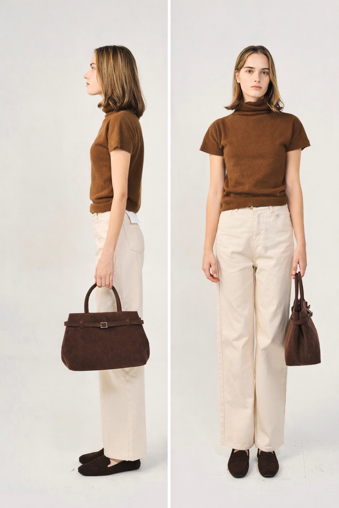 襟元はノーカラーデザインで、インナーにレースやハイネックのトップスを合わせると、洗練された大人の雰囲気に。柔らかく軽やかな着心地ながら、しっかりとした暖かさで早春の装いを格上げします。