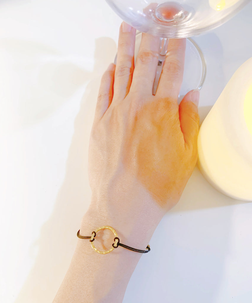 まずはこのブレスレットのチャームにご注目。フルムーン(満月)を表すゴールドの輪っかの間にあえて穴が空いているドーナツスタイルチャーム。これは金運を上げるために、あなたの腕に着用したり、ポーチなどに入れて持ちあるいた時にあなた側の部分が透けるようにし、このことでこのブレスの金運をあなたに金運を還元するように作られたブレスレットです。