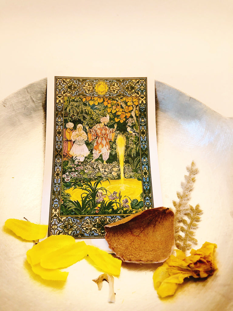 今回のアクセサリープレートの効果を何重にもレベルアップしてくれる「マネーファウンテンカード」です。このマネーファウンテンカードをまずゆっくりご覧ください。王様が黄金の泉を発見しとても驚いています。豊かな黄金の泉からは限りなく富が噴き出しています。こちらは持ち歩きせず、必ずこのプレートにのみ置いてください。他の場所に持ち出すと効果が下がってしまいます。